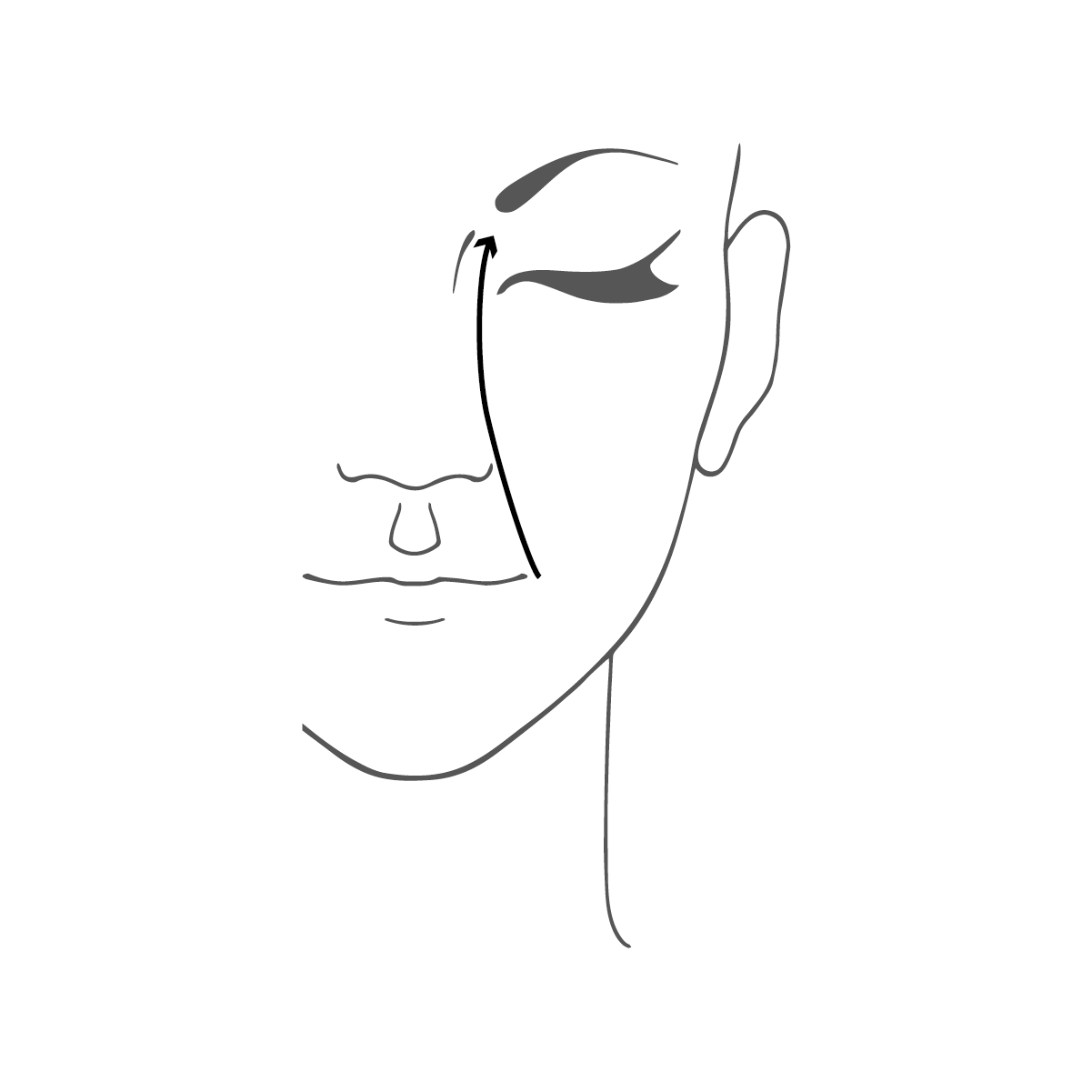 With your ring finger—the gentlest to use—glide from the corner of the lips along the nasolabial fold, all the way up to the brow.
